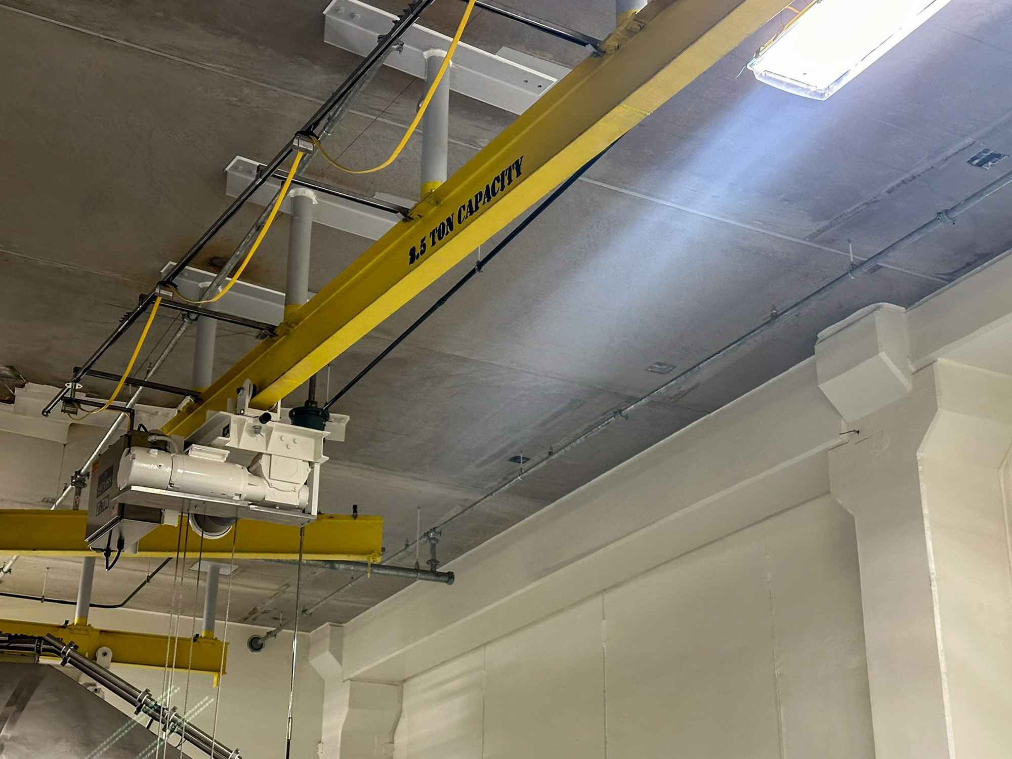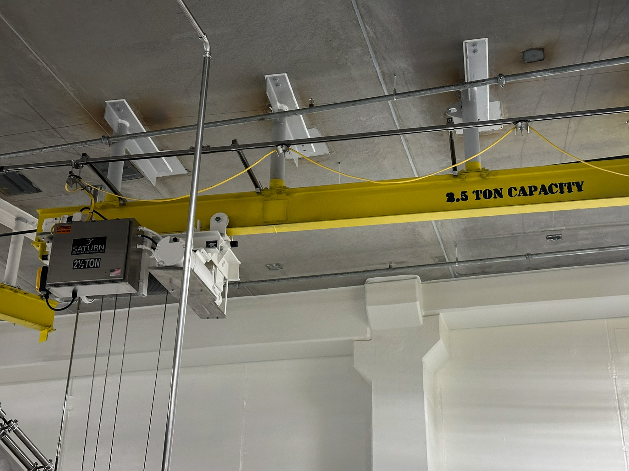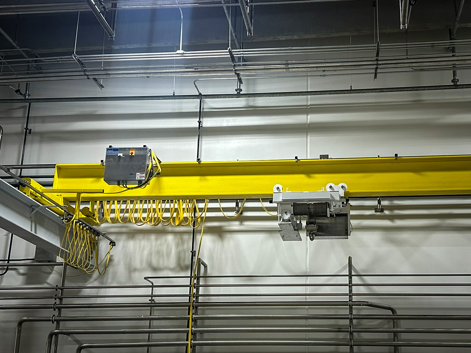 In addition to the major motorized bridge crane systems, our team also installed mutliple ceiling-mounted monorail cranes throughout their facility. These ranged from 1-ton to 2 1/2-ton and featured similar food-grade features including the tapered flanges, food grade epoxy finishes, and stainless steel hoist components.
