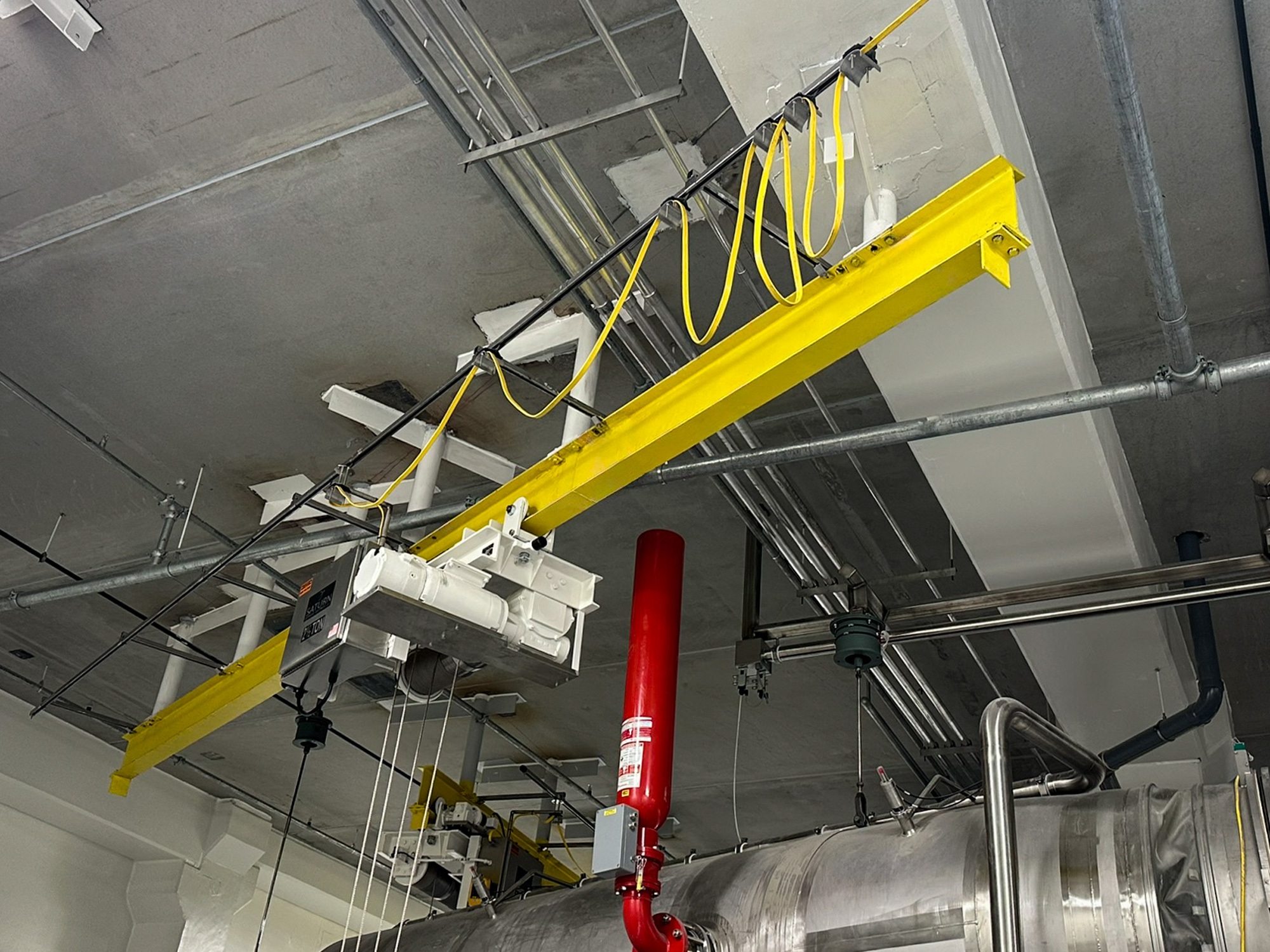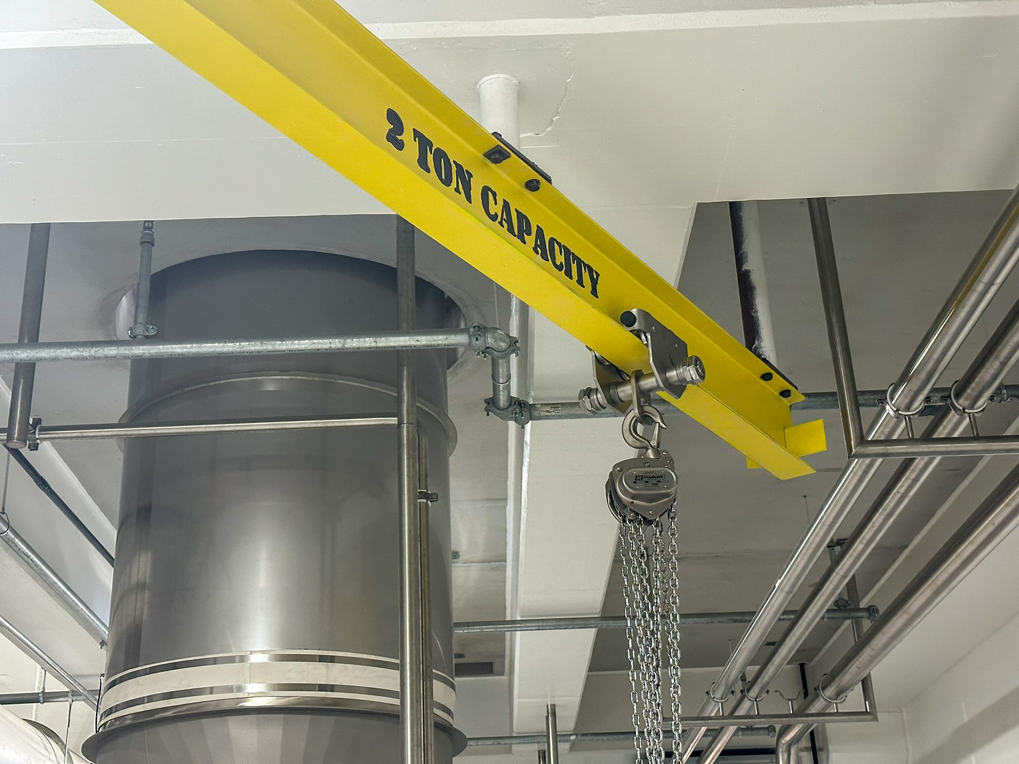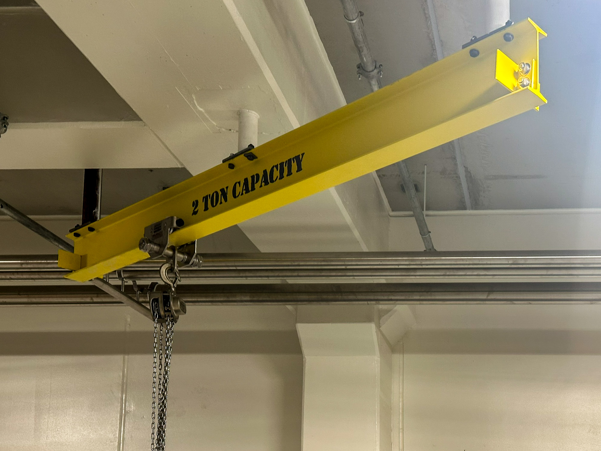 In addition to the major motorized bridge crane systems, our team also installed mutliple ceiling-mounted monorail cranes throughout their facility. These ranged from 1-ton to 2 1/2-ton and featured similar food-grade features including the tapered flanges, food grade epoxy finishes, and stainless steel hoist components.