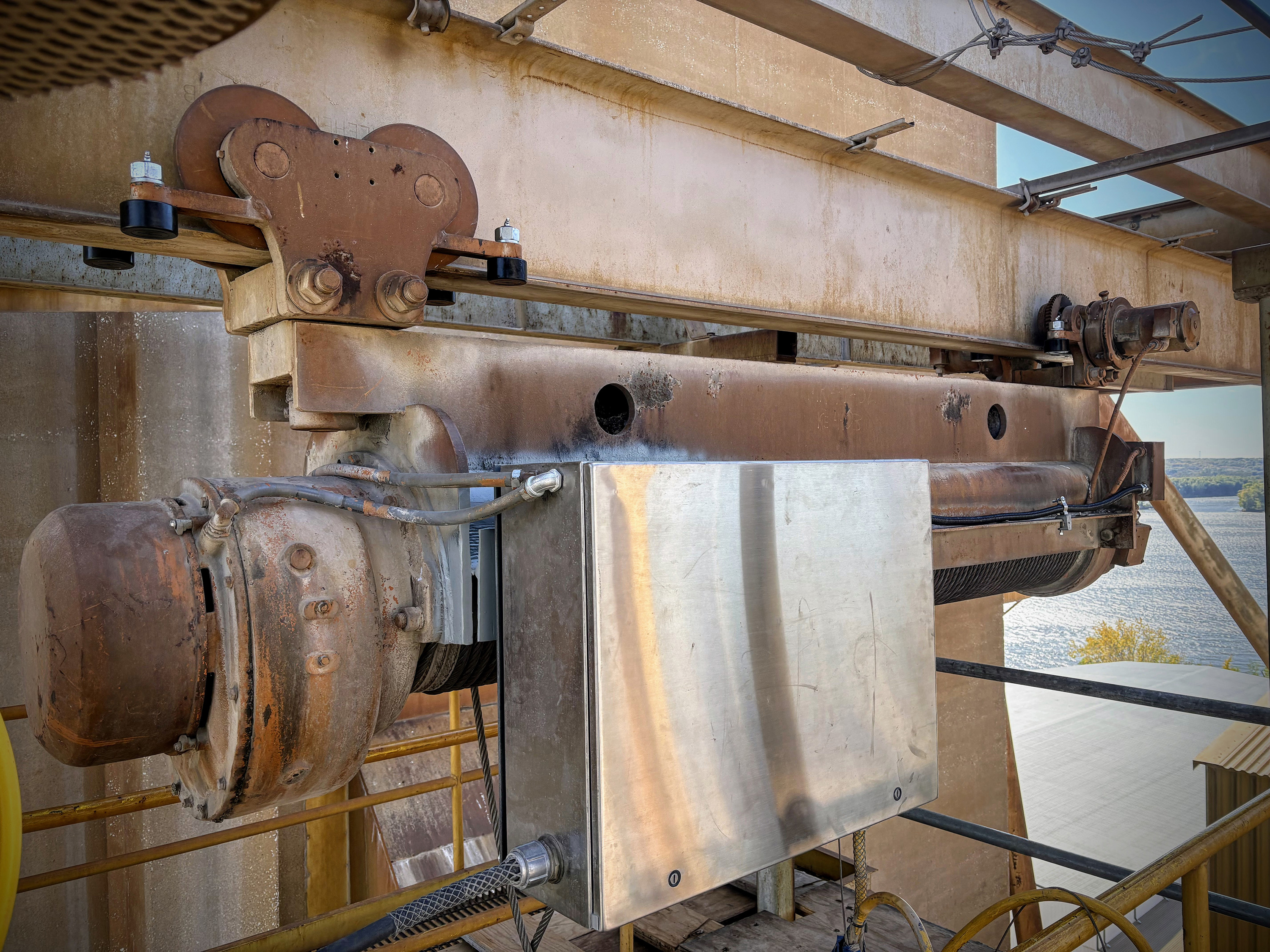 - Component Fabrication & Procurement: New structural steel components and a new dead-end pin were fabricated. A new stainless steel NEMA 4X enclosure was procured as part of the hoist modernization.