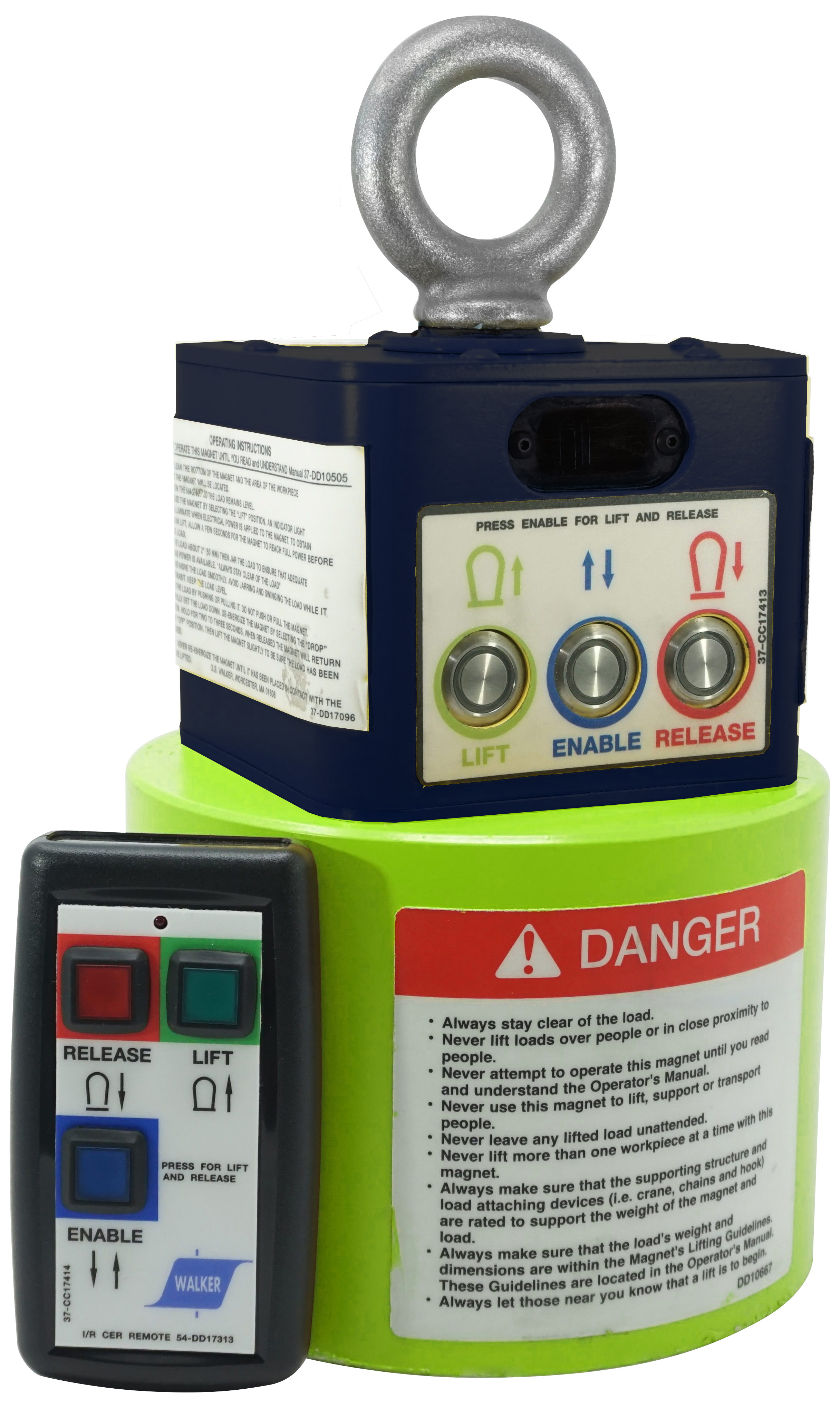 Versatile electric lift magnet that operates from any 120V outlet. Features remote control operation and solid-state circuitry for reliable steel plate and component handling.