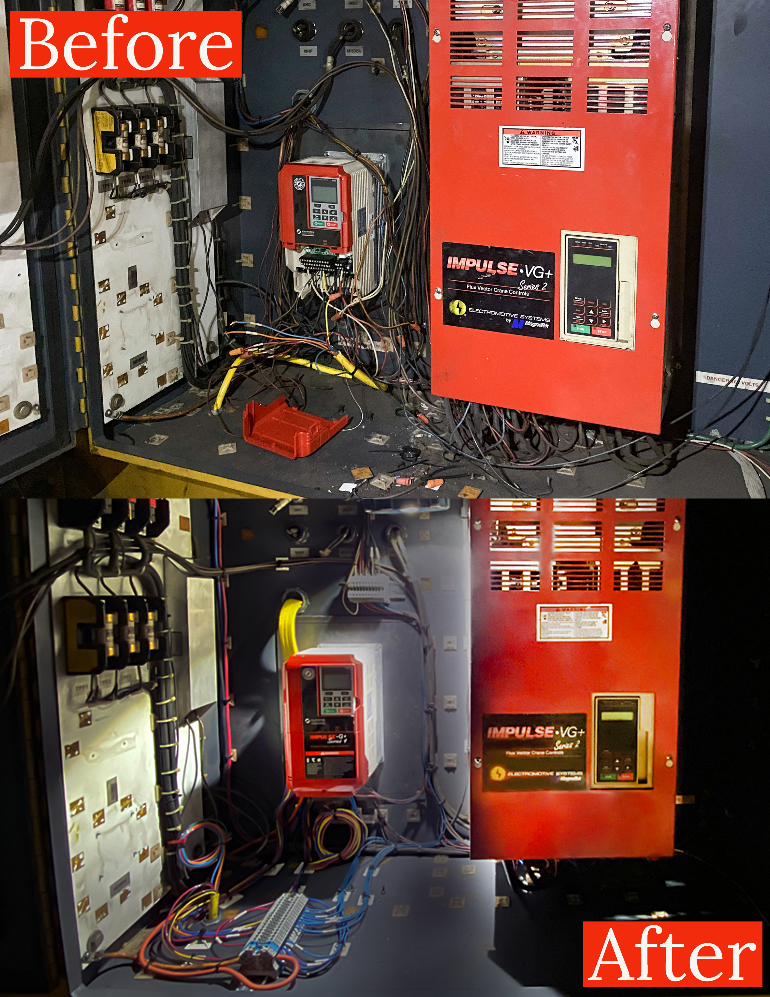 In the hoist/trolley panel, our team routed all the wiring making sure everything was organized and labeled correctly. They also reassembled the trolley VFD with its covers.