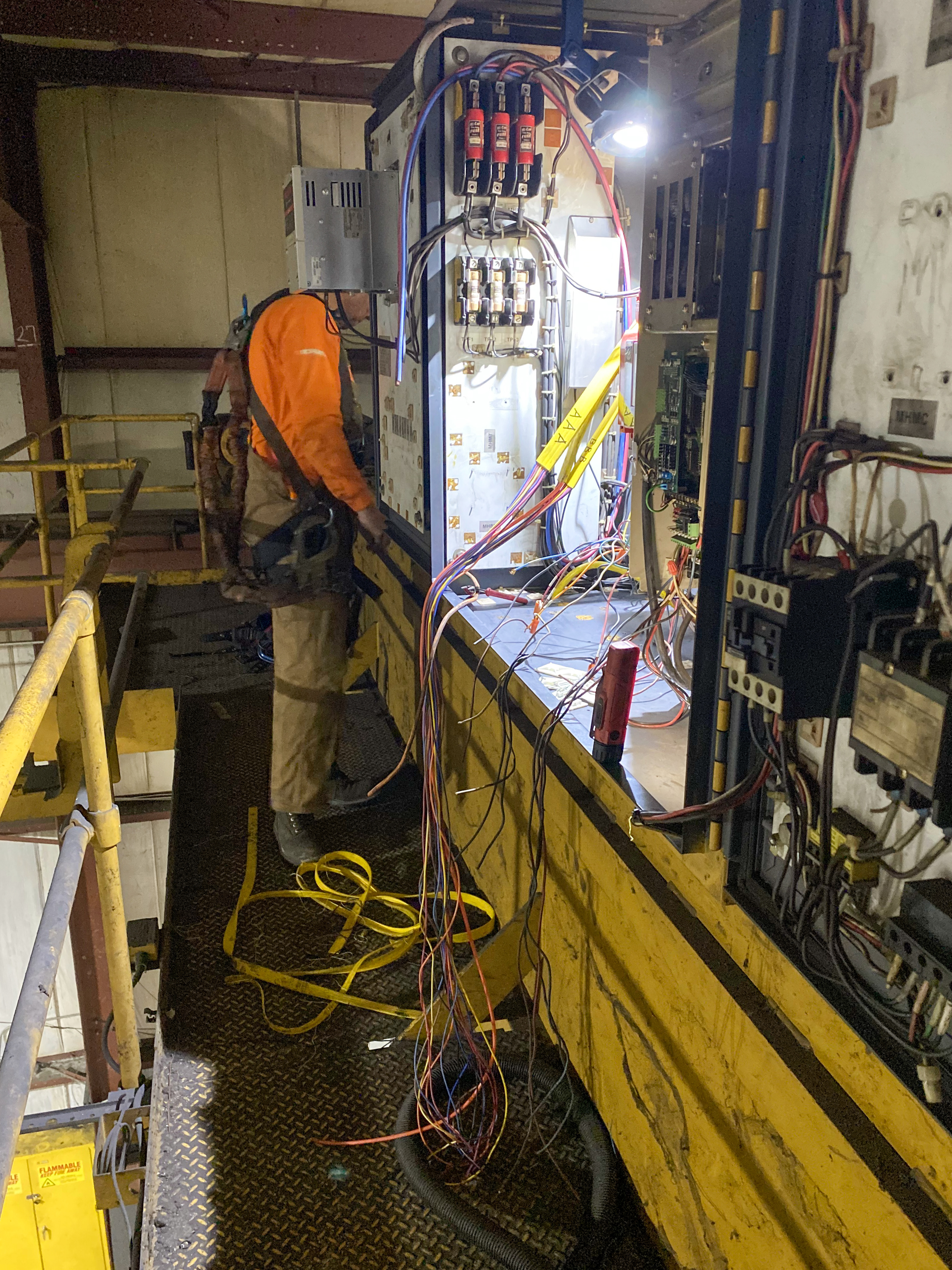 On the following trip, our team returned to complete the crane modernization. This involved removing the old festooning and installing the new one and routing it accordingly to the bridge control panel, hoist/trolley control panel, and a Bushman control panel for a lower block and coil grab device.