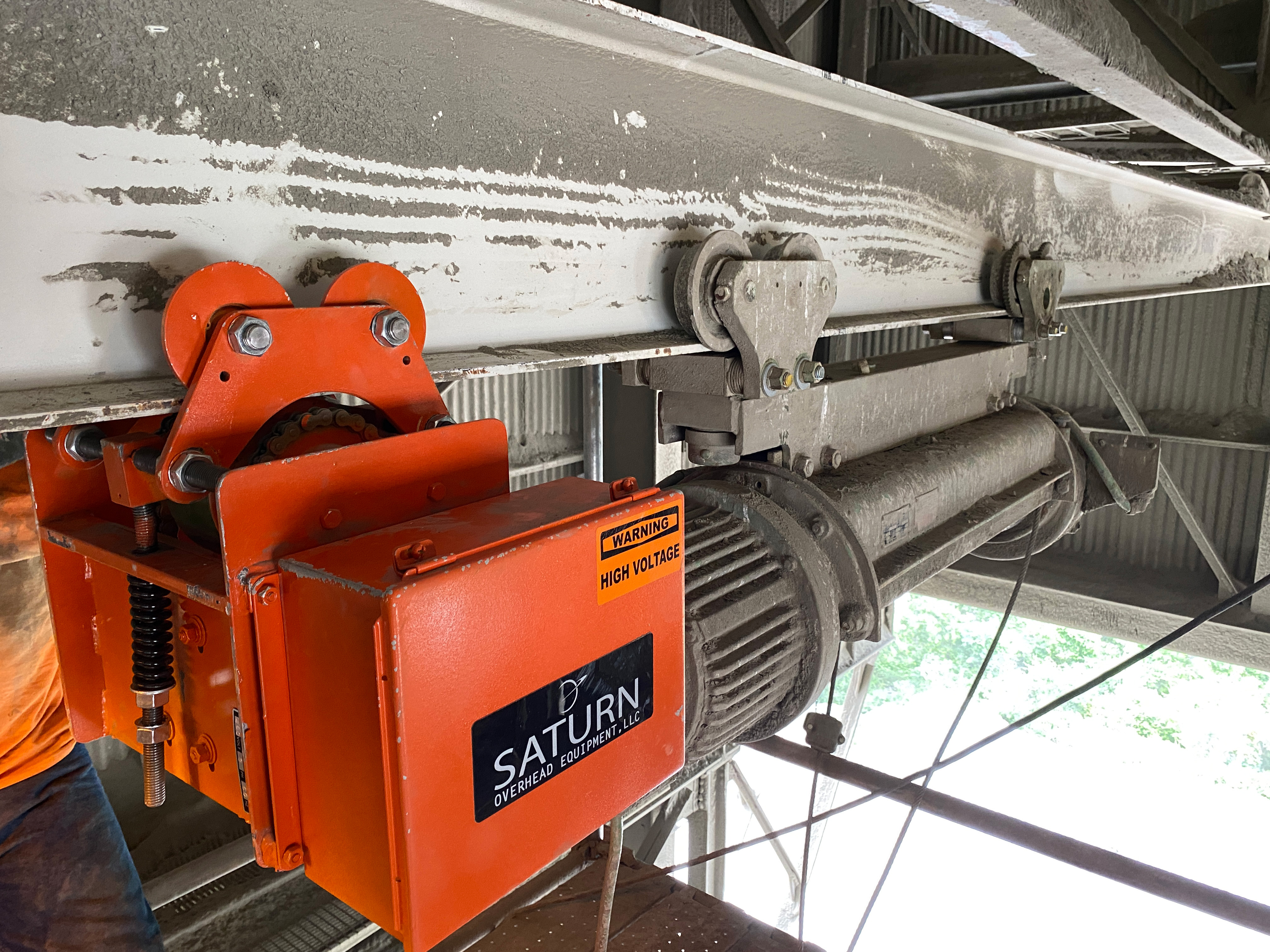 Solution: Drop the existing hoist down from the east/west monorail where it had a chain trolley that was no longer functioning. It was lowered through the scaffold floor, relocated 10 feet, and lifted back up through another scaffold floor onto a different monorail. We then installed a new Saturn Tractor Drive, a new pendant, and a turret cord reel.