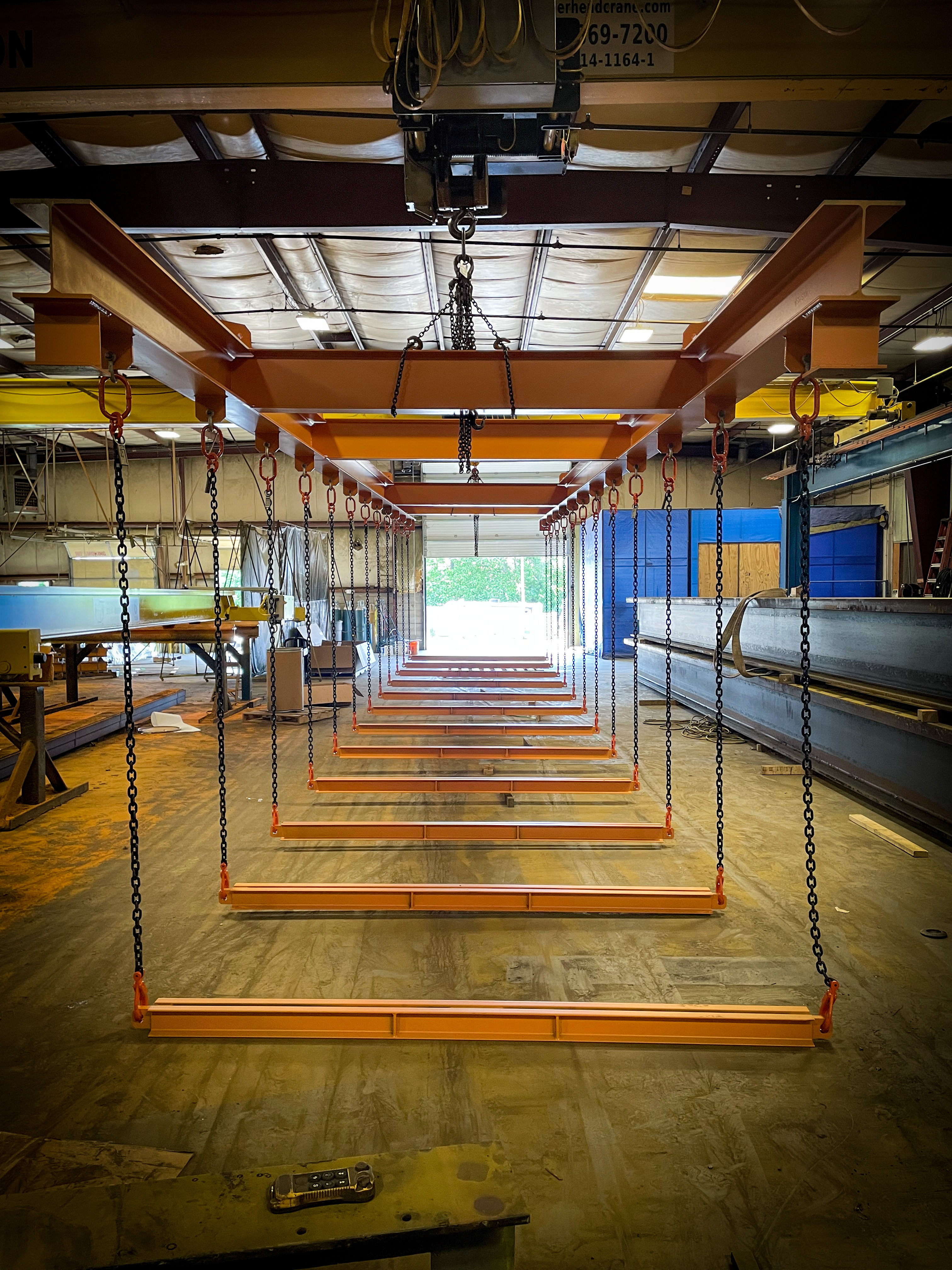 This Custom 4-Point Dual Lifting Beam Assembly was developed for a lumber company to help them load flatbed trailers. The fixture has a capacity of 23 tons and runs 50 feet in length allowing it to lift full bundles of wood up to 45 feet long. Once loaded onto the trailer, the lifter will be used to drape a large tarp over the cargo to cover the shipments for transportation.