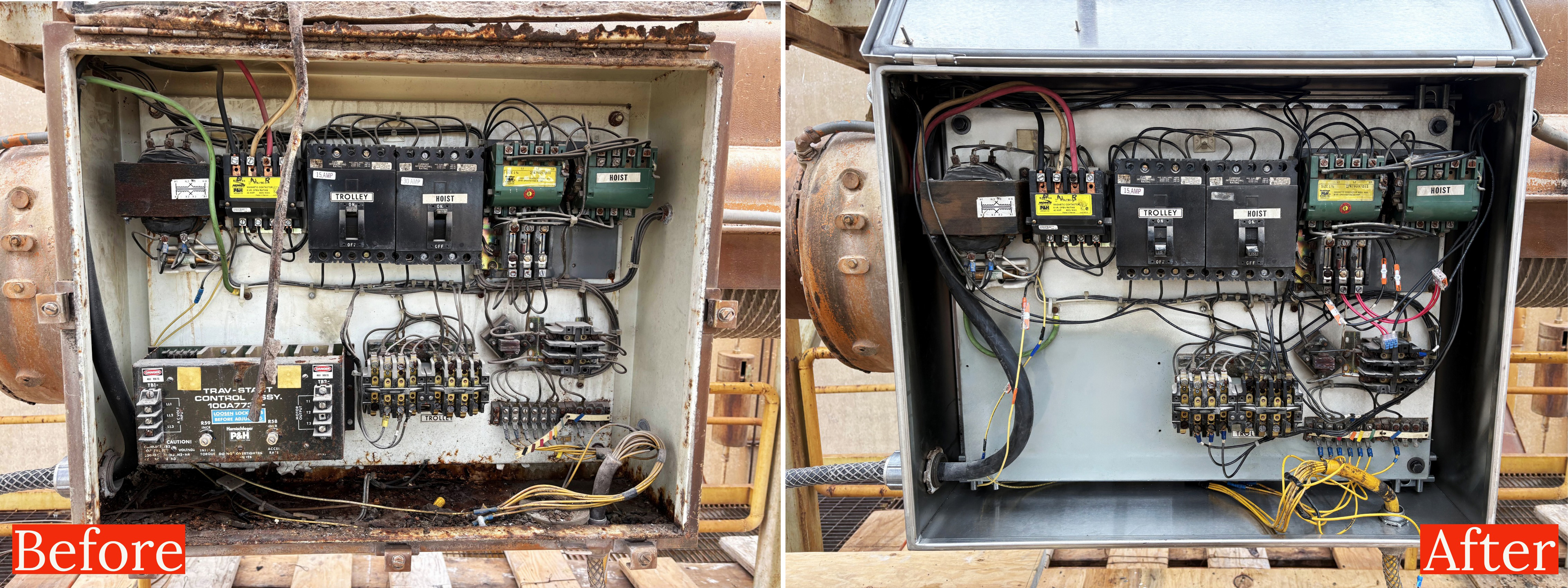 - Component Fabrication & Procurement: New structural steel components and a new dead-end pin were fabricated. A new stainless steel NEMA 4X enclosure was procured as part of the hoist modernization.