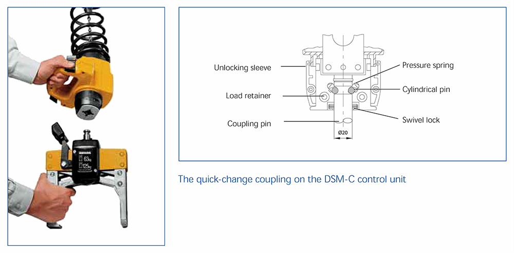 Quick-change coupling for a variety of load handling attachments (load hooks, pantograph tongs, clamping and shaft grippers, parallel gripper systems, specifically developed load handling attachments).