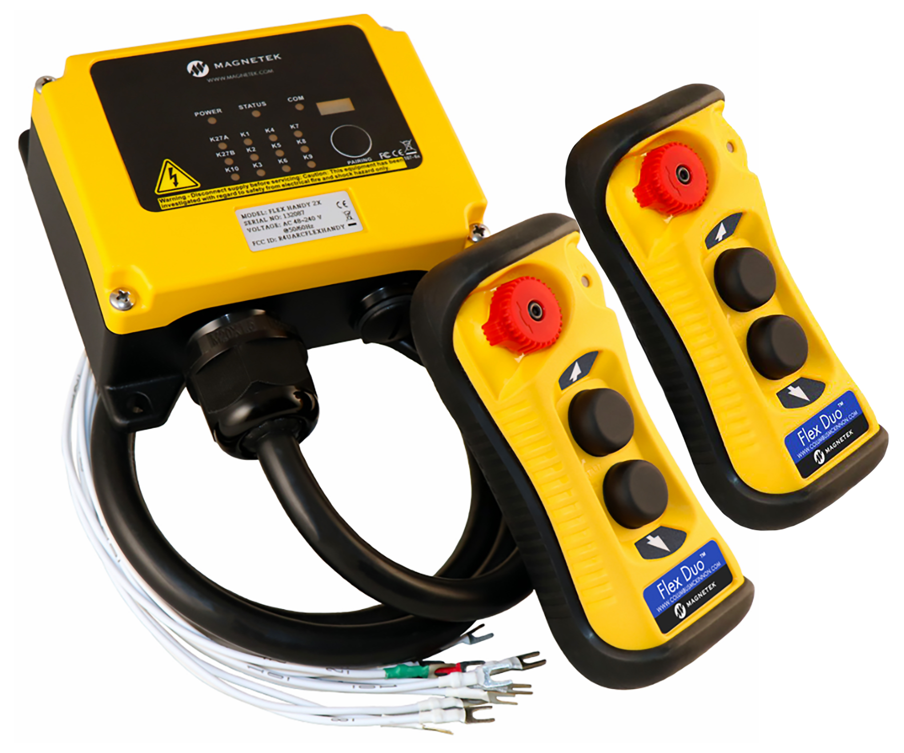 - System Includes: Two transmitters with a pair of 2-speed pushbuttons & E-Stop button, Flex MRX receiver with pre-wired cable and horn kit, wrist strap, belt clip, pushbutton label sheet, keypad label sheet, and user manual on CD.
