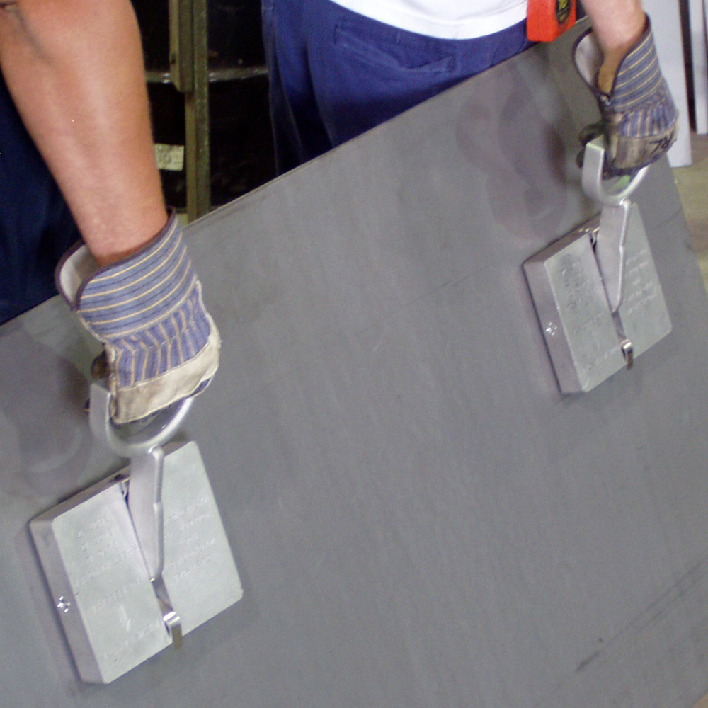 Ergonomic magnetic handler for moving steel sheets and hot parts safely. Designed for one-person operation with protection from cuts and burns.