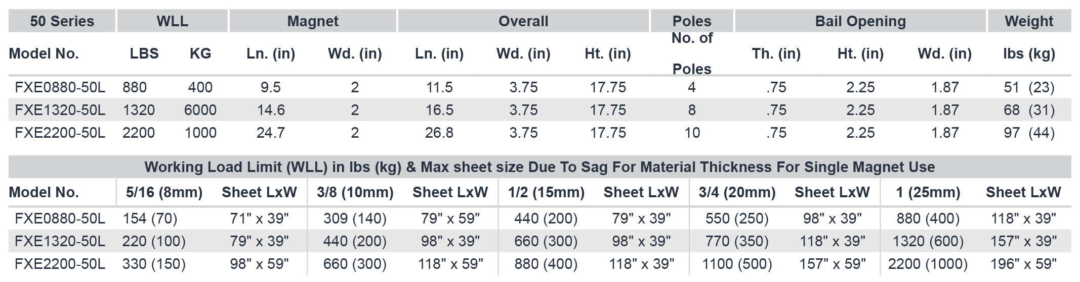 The FXE 50L Series magnet is ideal for lifting long, narrow parts such as I-beams and C-channels. Its design allows for secure handling and easy orientation adjustments.