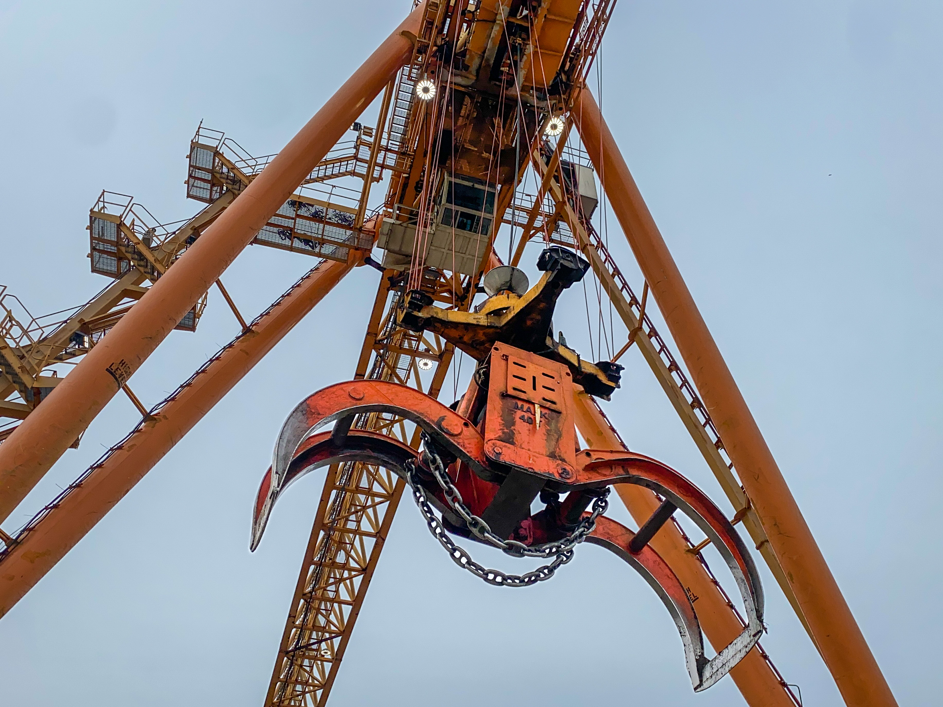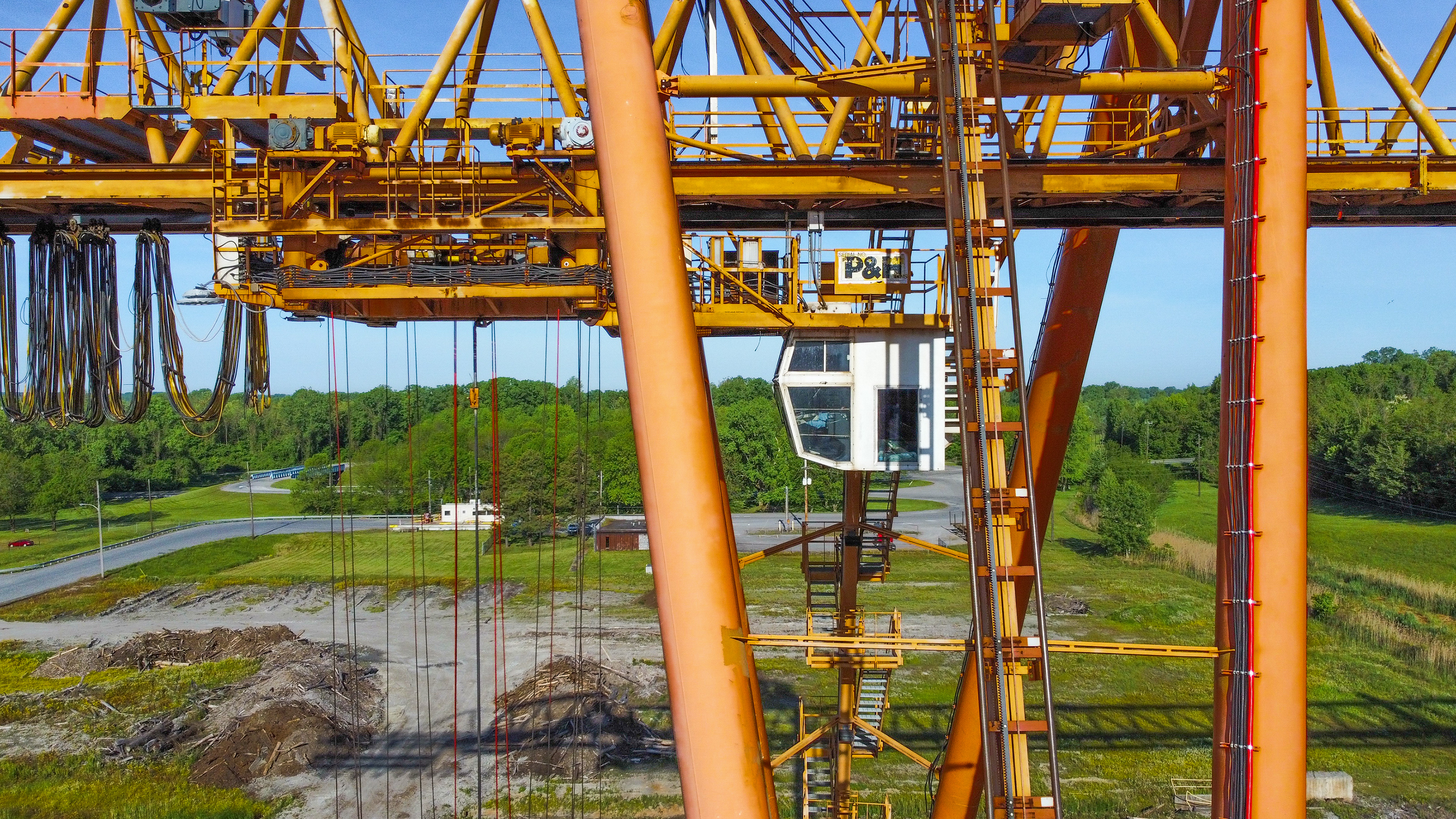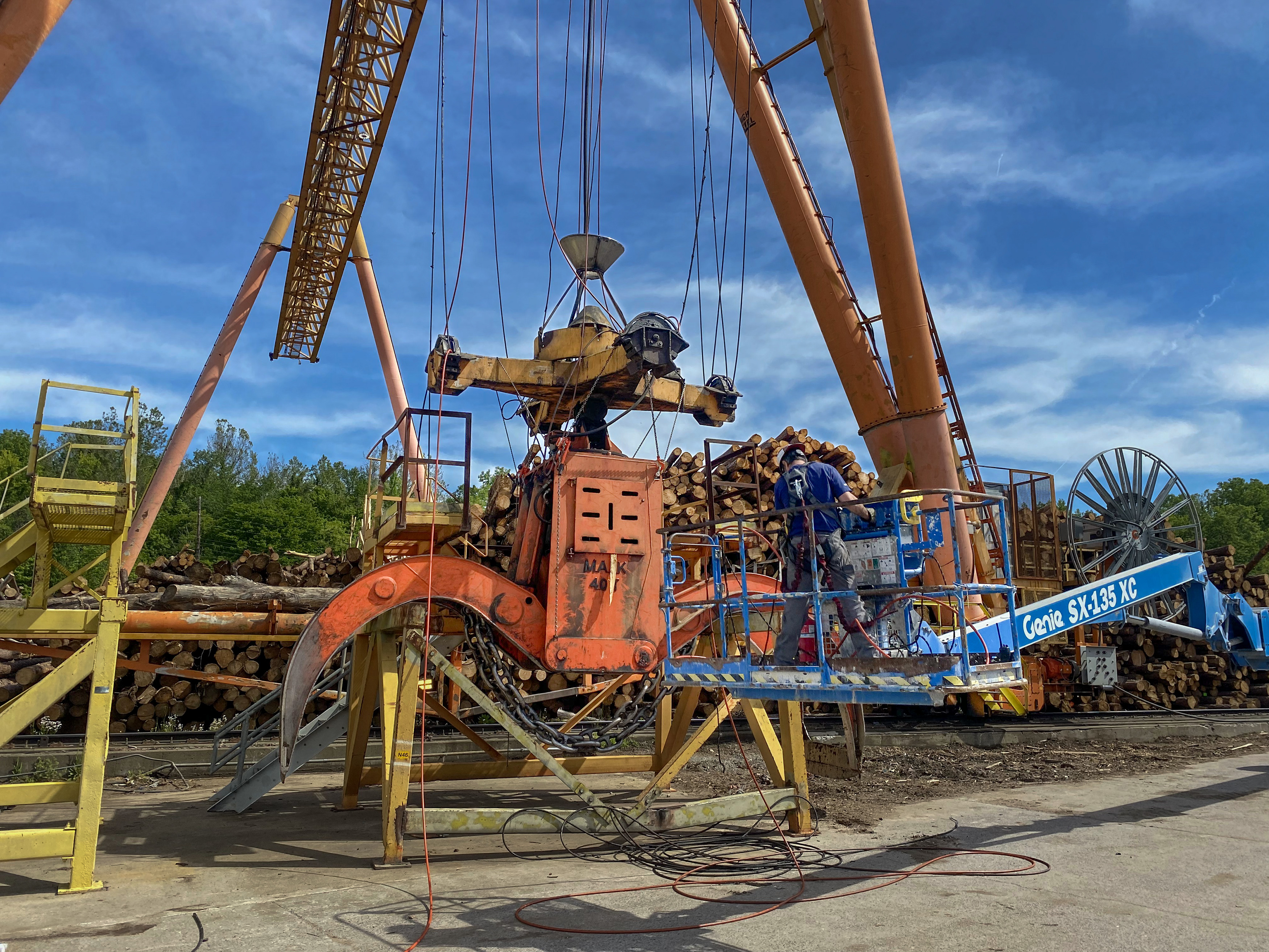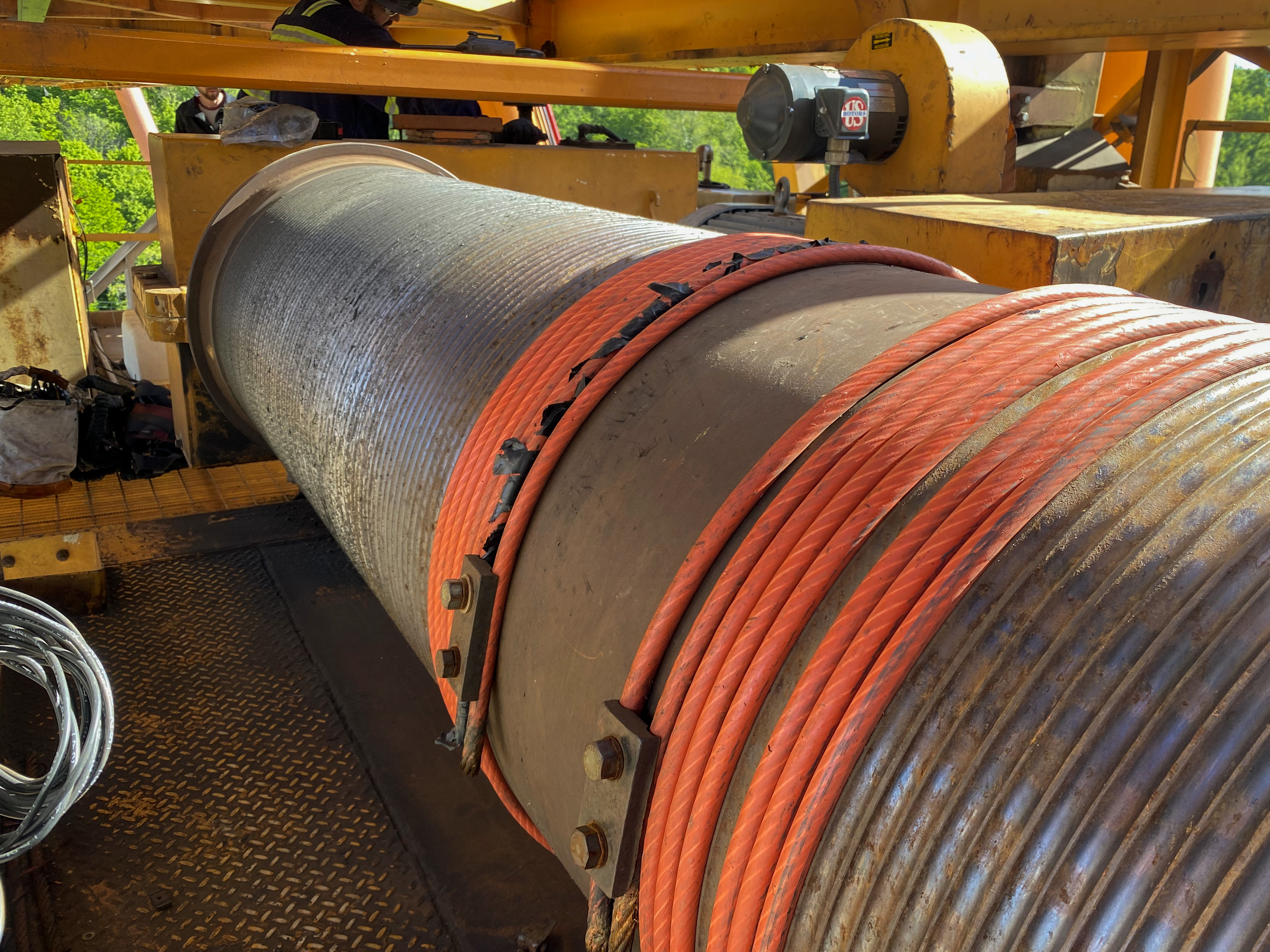 Tri-State Overhead Crane's service team changed out all of the wire ropes on the portal crane. The crane features four ropes on the hoist itself, with a hydraulic claw for a lower hook with a max capacity of 40 tons. And the ropes are required to be changed every six months. Our crew had 4 technicians involved in the process, with two guys up on the crane deck and two in a lift.
