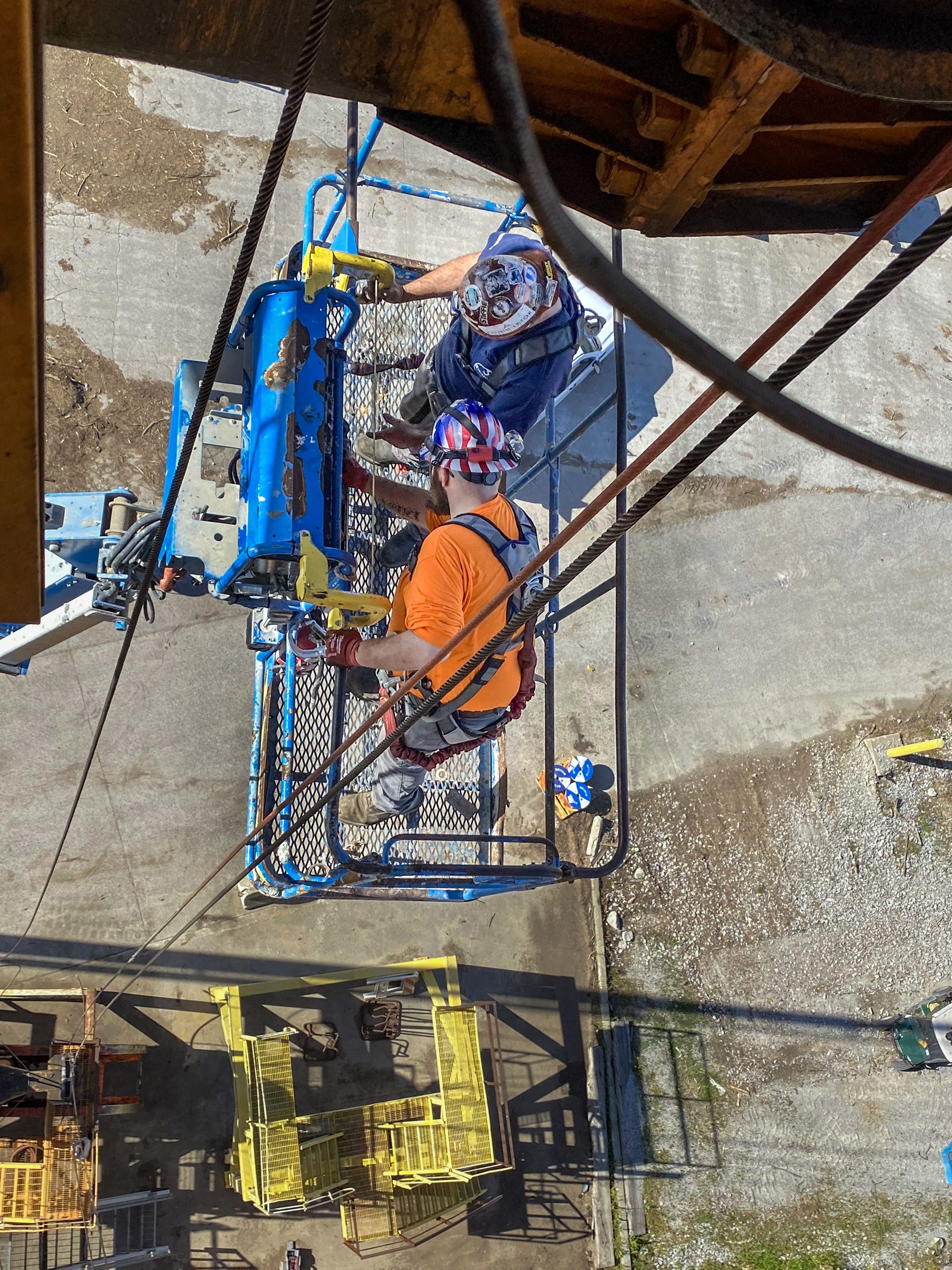Taking it one rope at a time, the process started by removing a dead end and then safely lowering it to the ground with the lift. From there, the dead end was cut off, a new rope was attached using a Kellems grip, and the reeving was pulled by hand. This part of the process took the longest, as each rope was over 300 feet long.